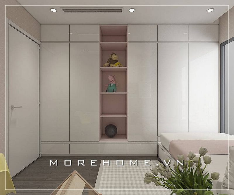 Mẫu thiết kế tủ quần áo có phong cách hiện đại và kịch trần âm tường để trang trí phòng ngủ của bé gái.