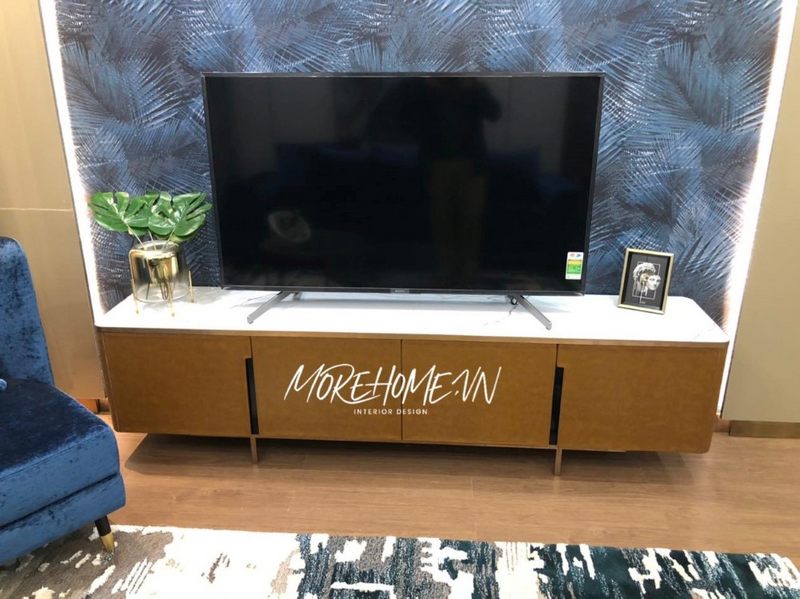 Morehome đã thực hiện mẫu kệ tivi phong cách hiện đại với khung gỗ công nghiệp kết hợp chân kệ inox mạ vàng cao cấp.